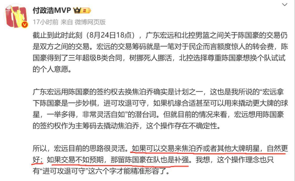 不过广东引进陈国豪,并不一定就是要自用,付政浩还在文末中表示:“宏远拿下陈国豪是一步妙棋,进可攻退可守,如果机缘合适甚至可以用来撬动更大牌的球星,一举多得,非常灵活自如。”考虑到此前曾有消息传出广东在追求23岁的焦泊乔,所以陈国豪的加入,并不排除可能会是他们追逐焦泊乔这位曾经入选过男篮集训队的“准国手”的一个重要筹码。