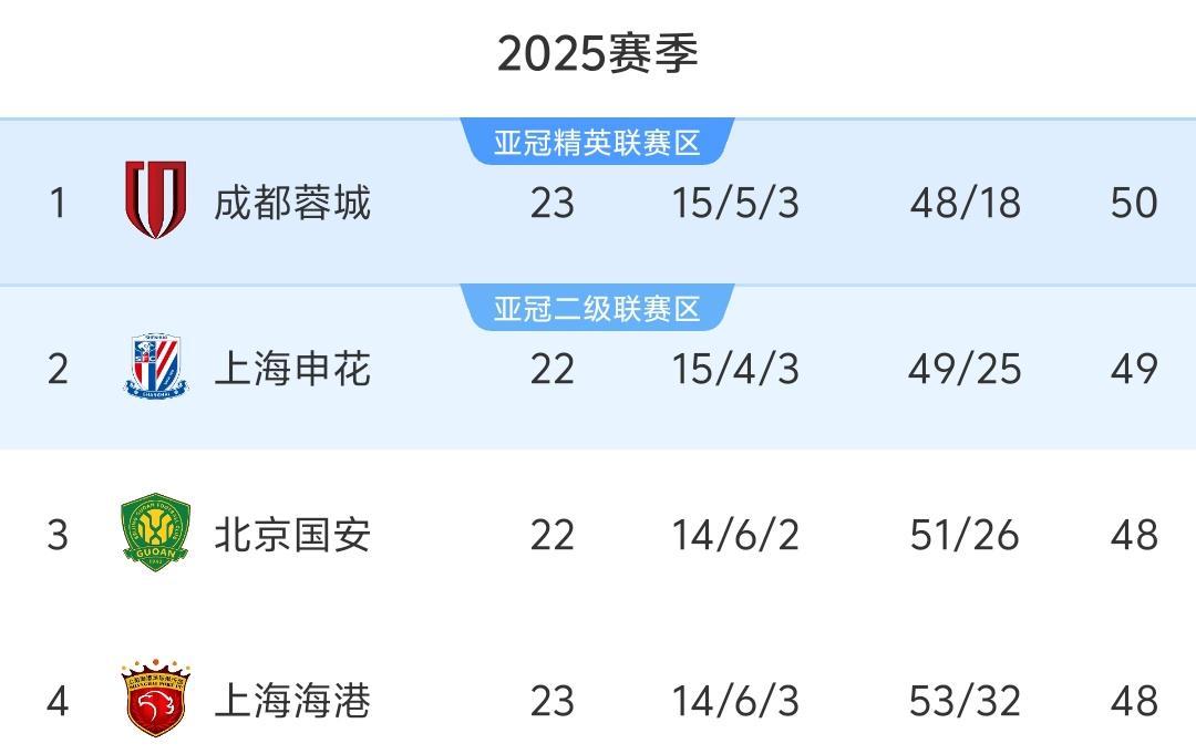最新积分榜方面,争冠格局迎来巨变。成都蓉在完成对上港的赛季“双杀”之后,成为本赛季首支积分达到50分的球队,在先赛一场的情况下暂时登顶榜首。上港在2轮不胜之后仍积48分,跌到了第4。